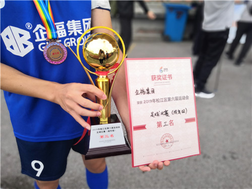 在经历了66场精彩比赛后,2019年松江区第六届运动会足球赛(成人组)最终决出了前八名,企福集团团队荣获第三名的好成绩。颁奖仪式上松江区体育局局长马红英、松江区体育局竞训科科长刘丽霞等为获奖单位及个人颁发奖状、奖牌、奖杯。